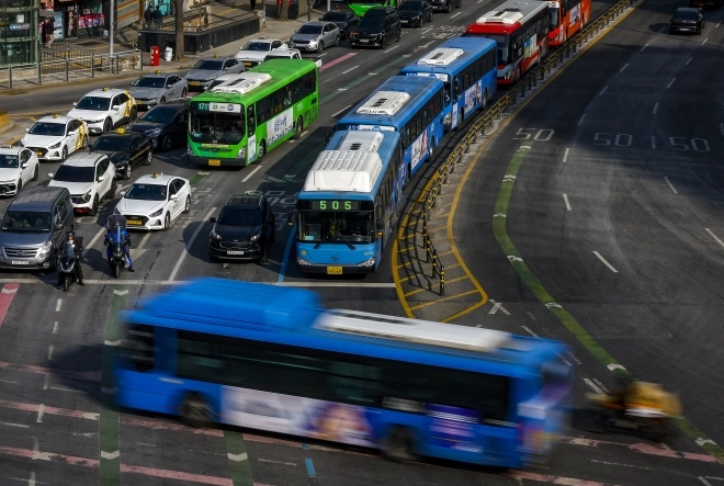 | 통상임금 쟁점을 두고 사측과 1년 간 첨예하게 대립해온 서울 시내버스 노조가 총파업 예고일을 하루 앞둔 12일 서울 중구 세종대로에서 버스가 오가고 있다. 2026.1.12 뉴시스 |